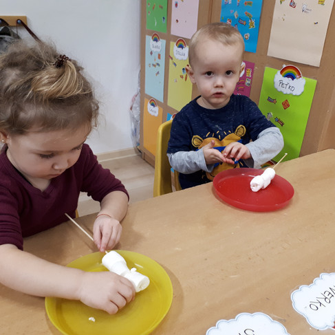 Care bears and unicorn class did a very yummy winter craft...do you ask how? Well marshmallows is the answer! :) They build a snowman using white marshmallow candies, they used lentils for buttons and yummy eyes, too! What was the best part of it? The one that came after - eating the snowman! Truth is we would rather make one real outside so we hope it will soon be possible :), because we do not want to see the snowman only on the plate. Fingers crossed to snow soon here in Pezinok!