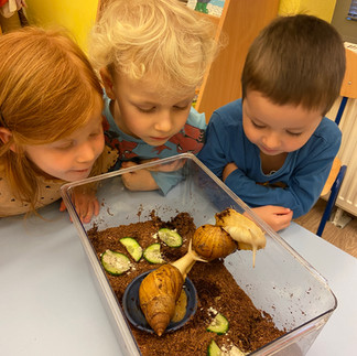 First, we familiarized ourselves with the snails—learning about the kind of animals they are, what they eat and drink, how to take care of them, and what is important for their well-being. During their stay at our preschool, we had the opportunity to observe their behavior. We watched how the snails eat and drink, how they act when they feel secure or insecure, and how we should properly handle them. We learned so many important things about taking care of a pet that needs attention.
